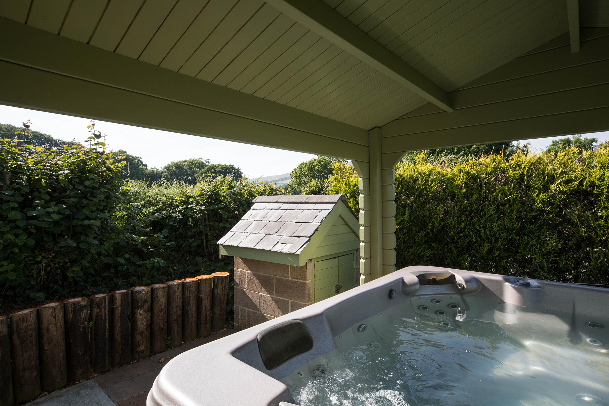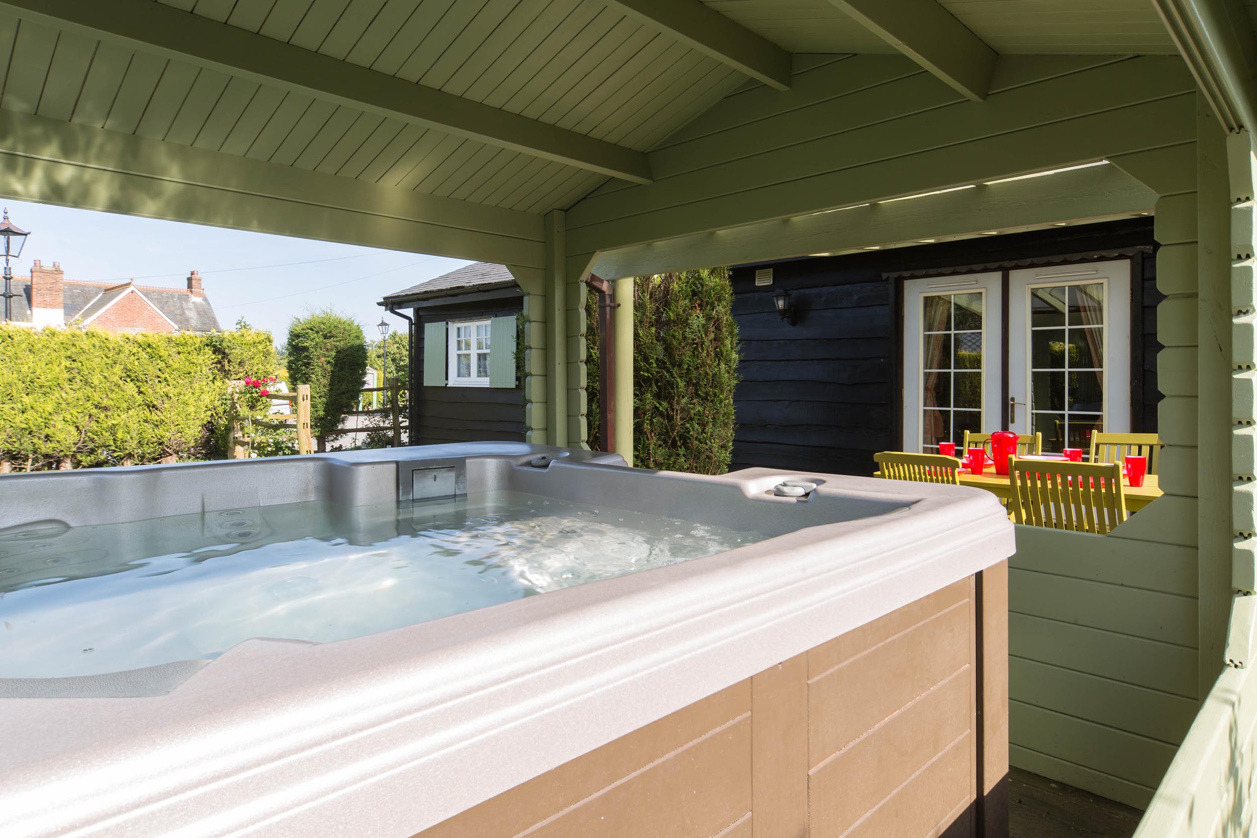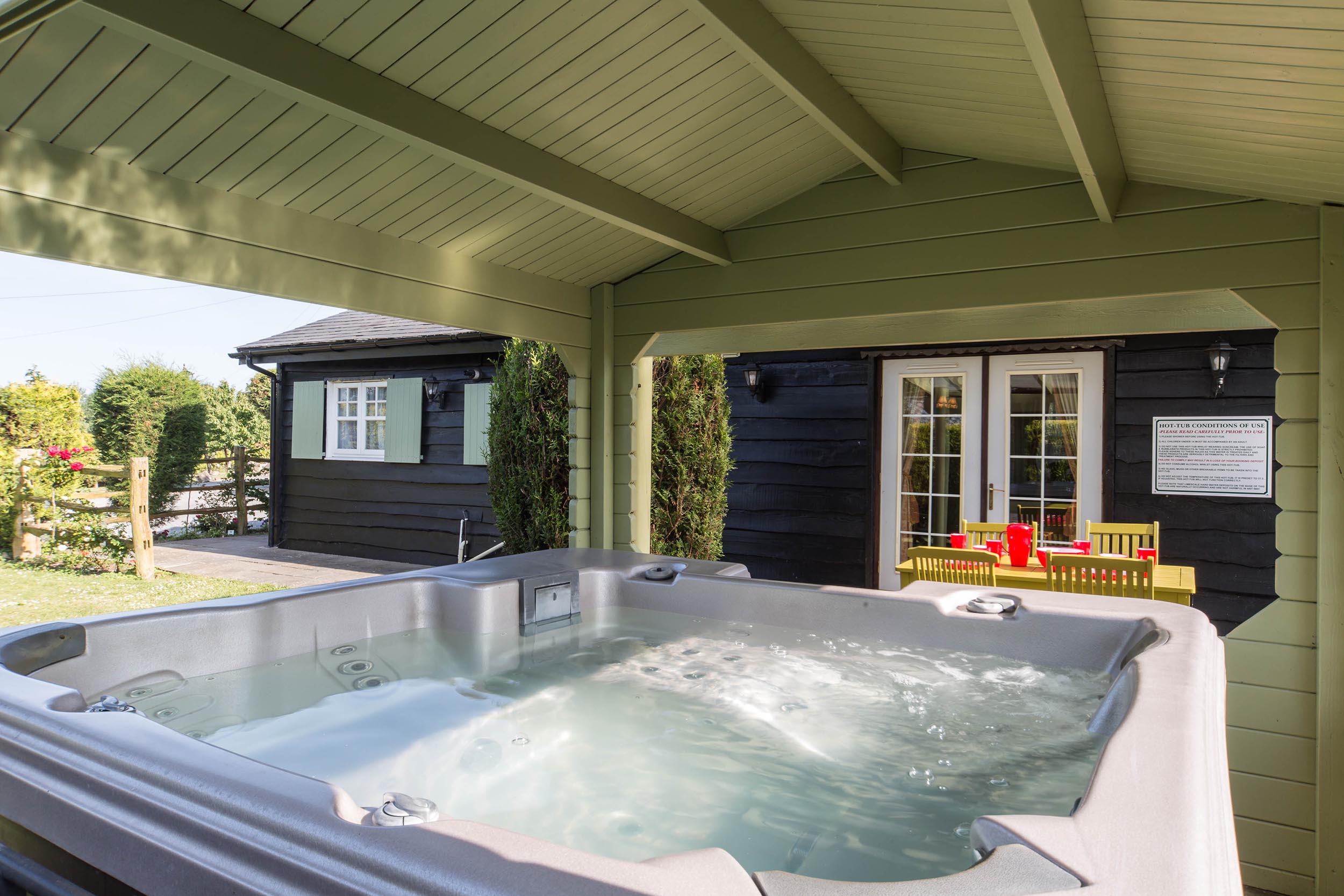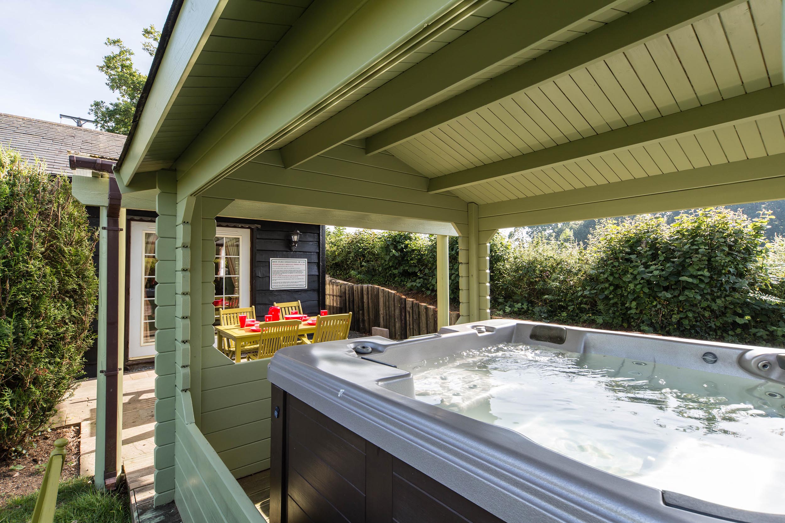 The cabin comes complete with a covered veranda, Jacuzzi/hot tub, and quality garden furniture on timber decking.