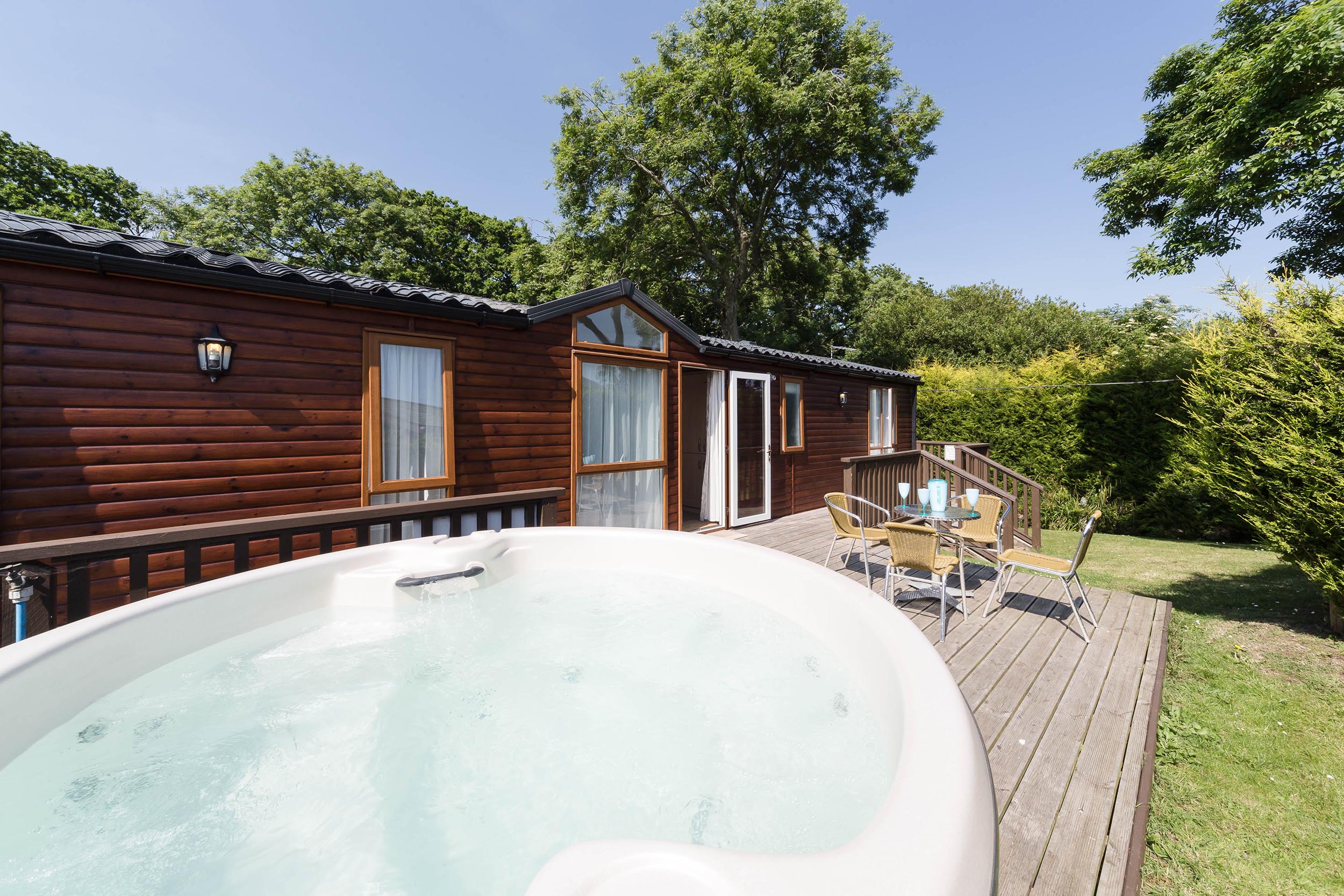 The Lodge comes complete with Jacuzzi/hot tub, and quality garden furniture on timber decking.